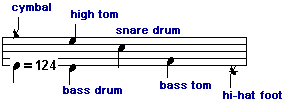 The starting exercise with the cymbal, the bass drum, the hi-hat foot and the snare drum..